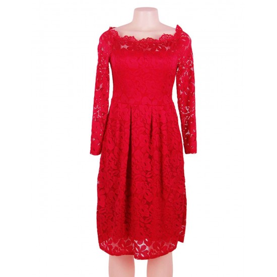 Plus Size Long Sleeve Fashion Red Lace Midi Dress