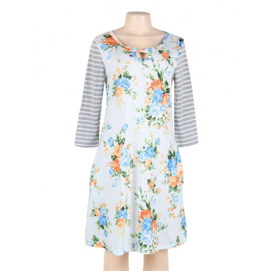 Plus Size White Floral Print Stripe Raglan Sleeve Dress